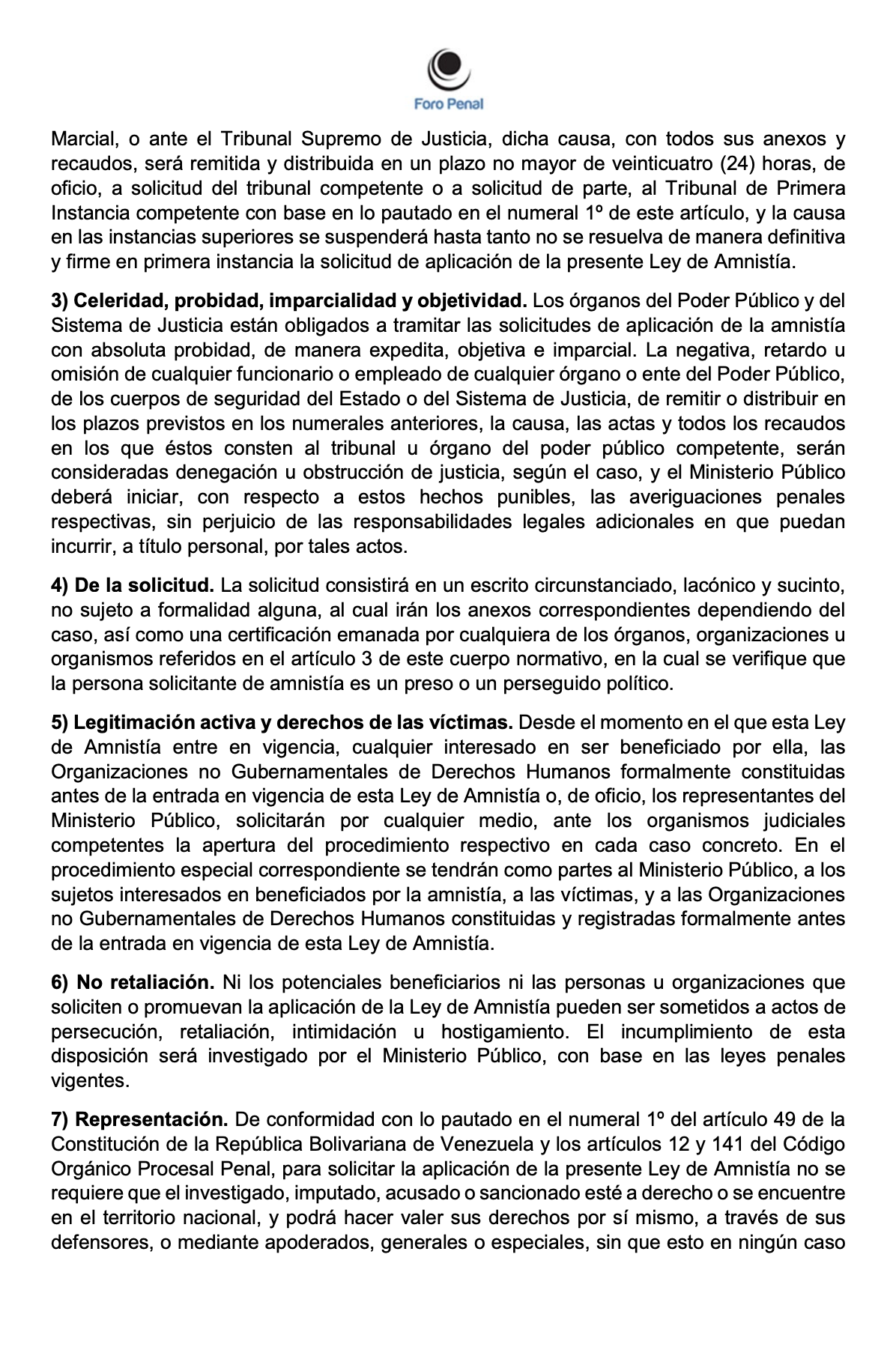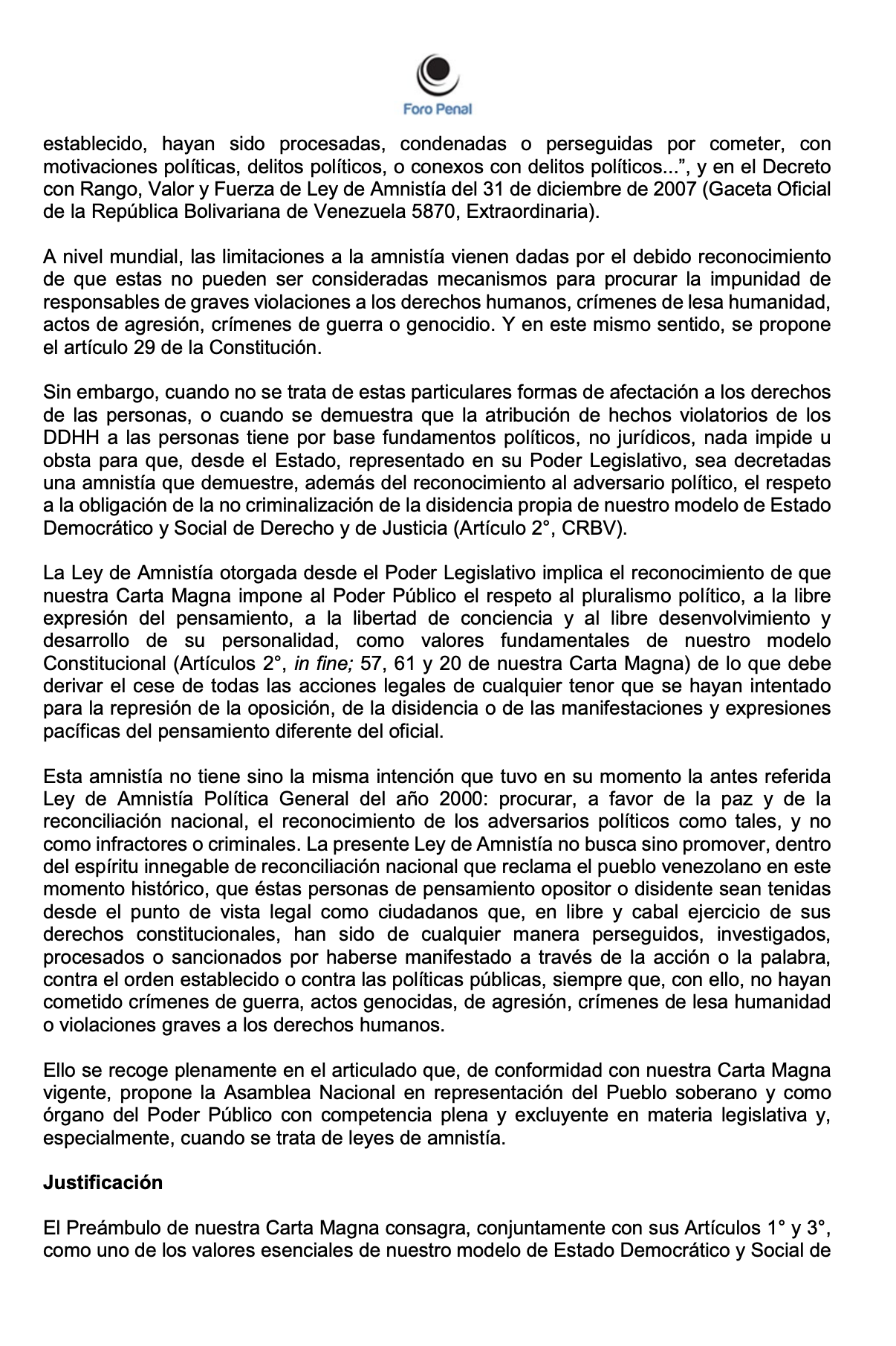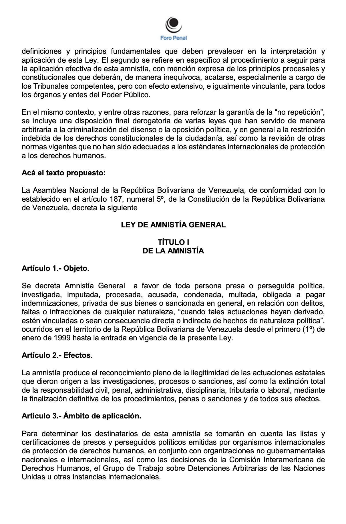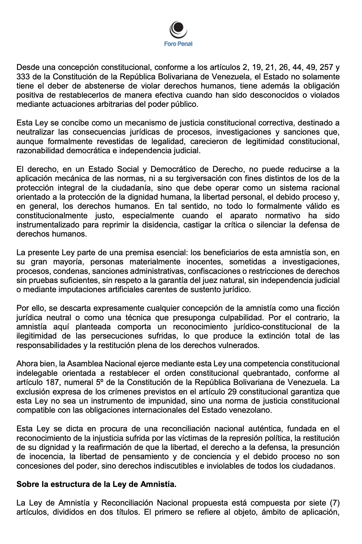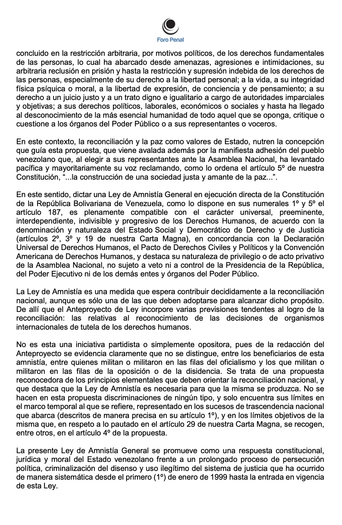 ANTEPROYECTO DE LEY DE AMNISTÍA GENERAL DE FORO PENAL - Enero 2026