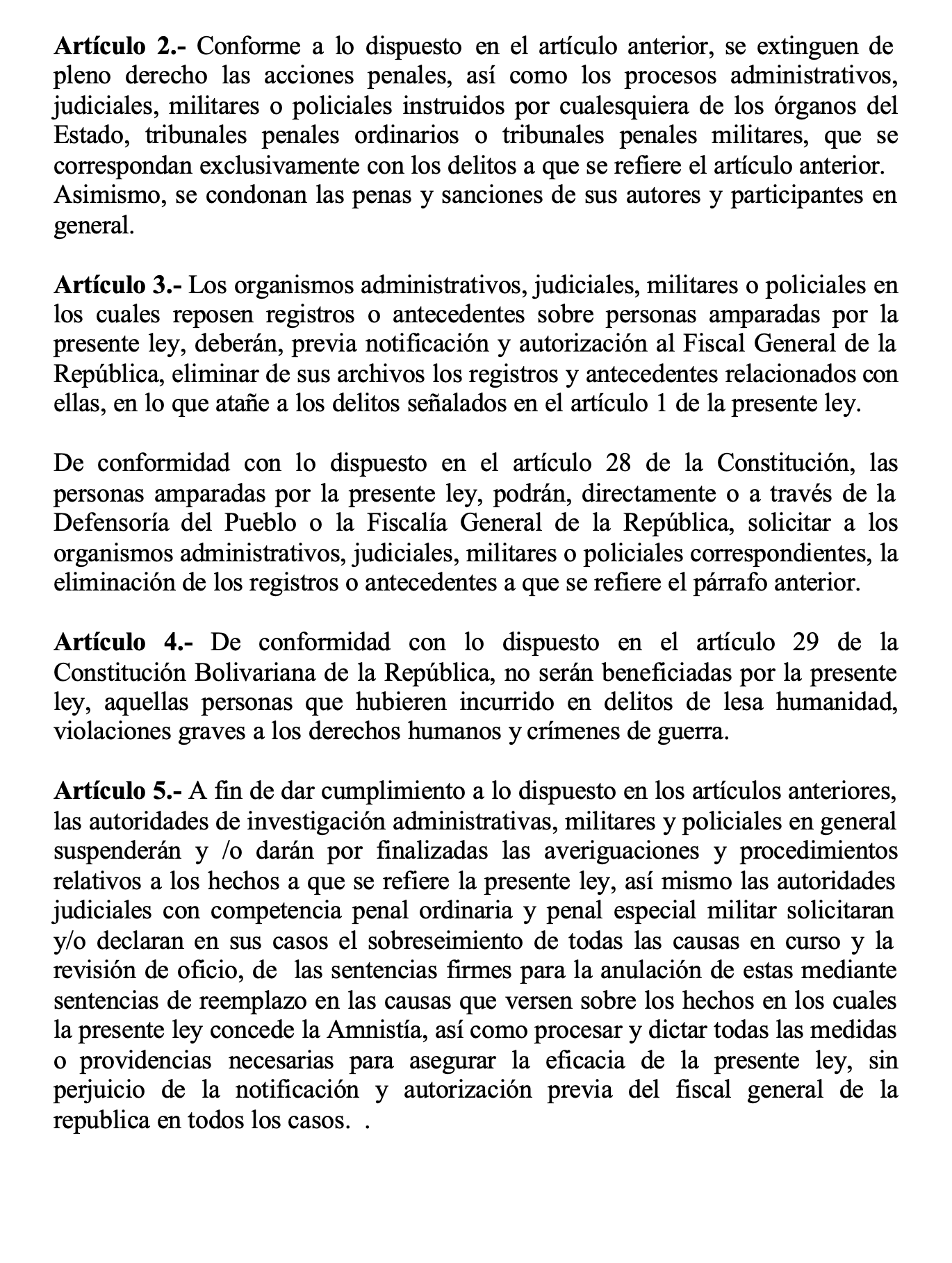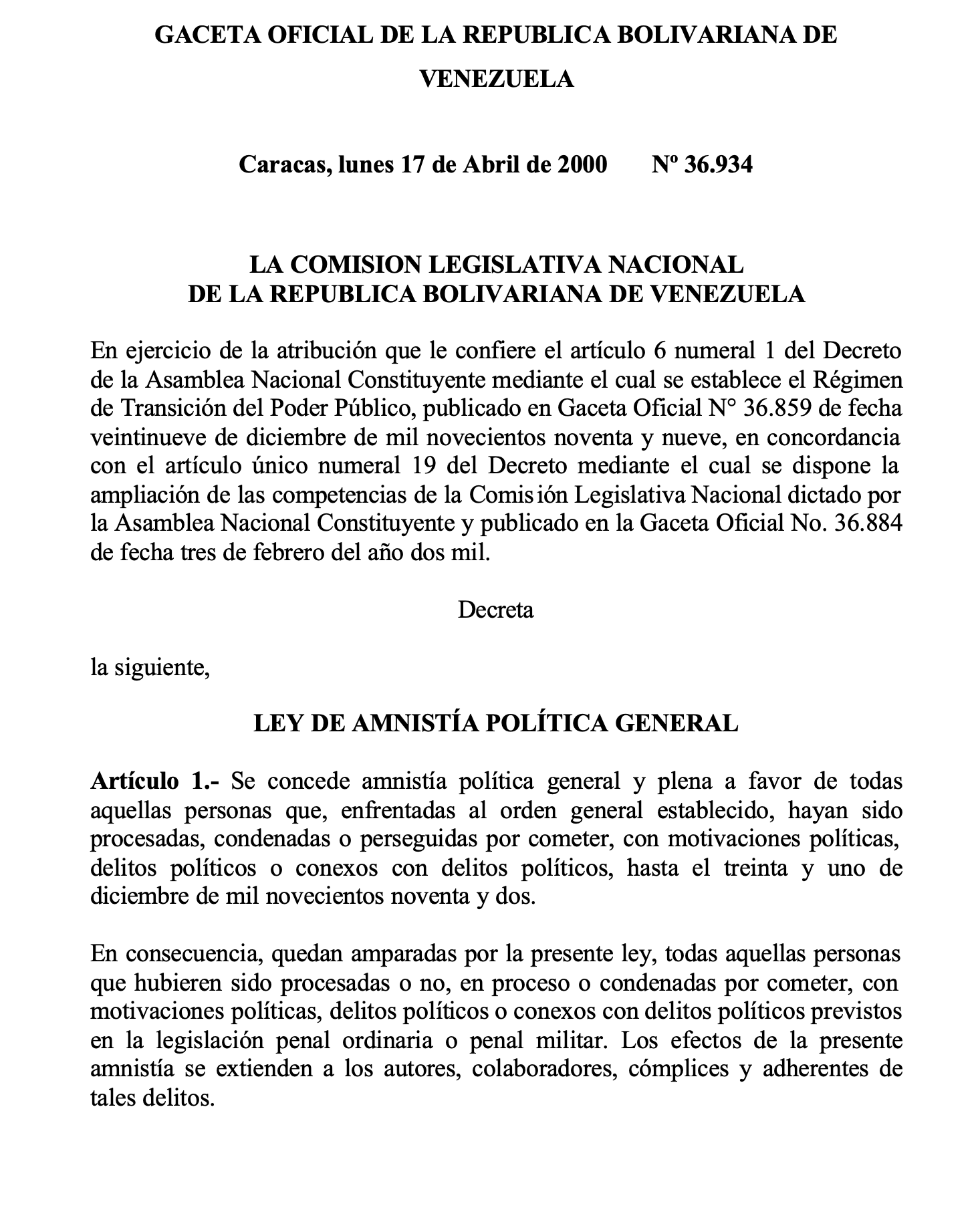 LEY DE AMNISTÍA POLÍTICA GENERAL - Abril de 2000.